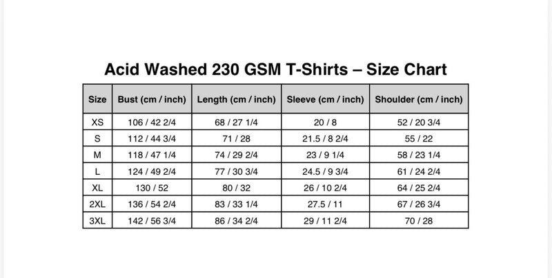 Each t-shirt is unique, with subtle variations in acid wash and colour due to lighting and display differences. Measurements are taken by hand—please allow a 1–3 cm variation.